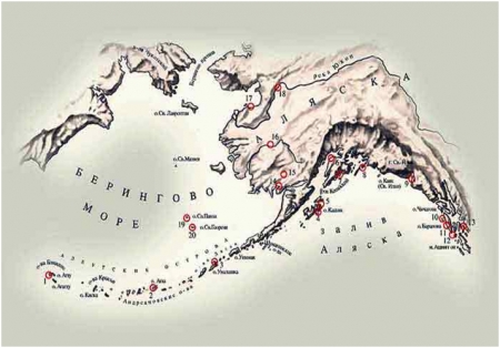 19, 20. Промысловые селения на о-вах Св. Павла и Св. Георгия. Кроме того, в РА входили Форт Росс (1812) – центр Российского отдела РА (недалеко от Сан-Франциско) – и Курильский отдел с центром на о. Уруп. Сведения взяты из книги А. В. Гринева «Индейцы тлинкиты в период Русской Америки. 1741—1867». Новосибирск, Наука, 1991 г.