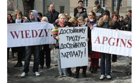 Во время посещения в Вильнюсе русской школы имени Софьи Ковалевской, где я побывал на уроке православной культуры у известного в России автора учебника «Основы нравственности» профессора Ольги Леонидовны Янушкявичене, мне дали листовку с приглашением прийти на митинг протеста против реформы, разрушающей систему образования в Литве. Против ликвидации традиционной модели образования национальных меньшинств Литвы. Поскольку у меня в день проведения митинга не было встреч и выступлений, а до отъезда было несколько часов, я твёрдо решил прийти на проспект Гедиминаса к зданию правительства Литовской республики. Хотелось вместе с соотечественниками почувствовать единение и проявить солидарность. Ведь с 1996 по 2009 год число русских школ в Литве сократилось с 85 до 35, число учеников в них – с 52,3 до 17,6 тысяч(1). По словам председателя Ассоциации учителей русских школ Литвы Эллы Канайте, по чьему приглашению я и выступал перед русскими учителями, сегодня русских школ осталось лишь 34 (из них 18 в Вильнюсе) и в них обучается чуть более 16 тысяч школьников. Учиться приходится по литовским учебникам, переведённым на русский язык.